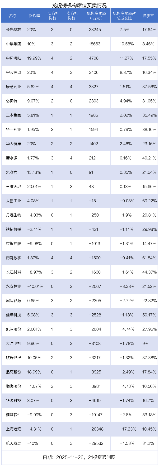 11月26日,30只个股龙虎榜出现了机构的身影,机构合计净卖出3.23亿元。具体来看,机构净买入12股,净卖出18股。