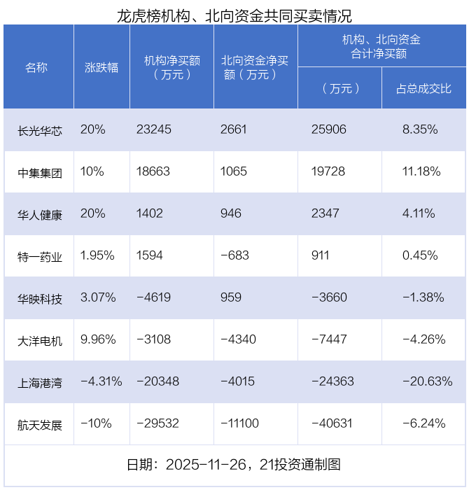值得注意的是,机构和北向资金共同净买入了长光华芯、中集集团、华人健康等3股;共同净卖出了上海港湾、大洋电机、航天发展等3股;在华映科技,特一药业上出现分歧,机构净卖出华映科技4618.96万元,北向资金净买入958.79万元;机构净买入特一药业1593.85万元,北向资金净卖出682.58万元。