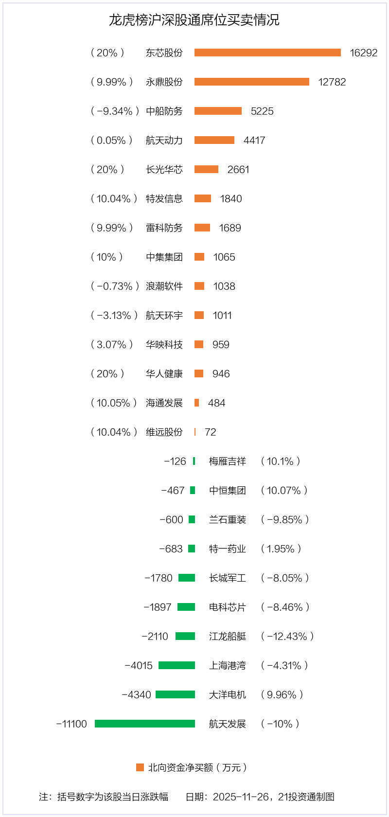 11月26日,北向资金参与龙虎榜中的个股共有24只,合计净买入2.34亿元。其中沪股通净买入9 股,净卖出6 股,合计净买入3.51亿元;深股通净买入5 股,净卖出4 股,合计净卖出1.17亿元。