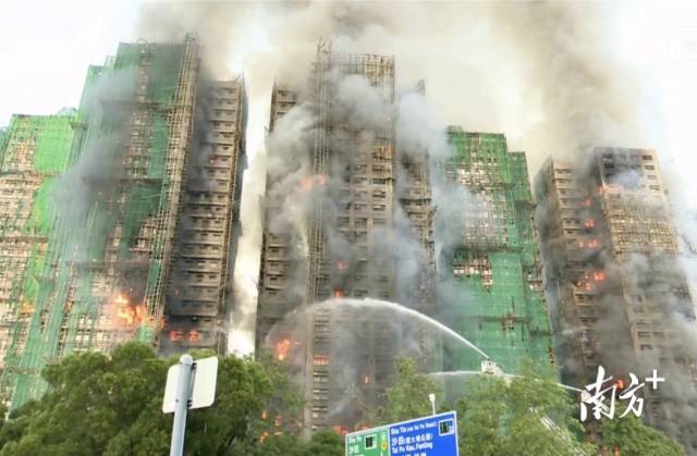 现场火势猛烈,多幢大厦同步起火,不断有杂物从楼上坠落,浓烟直冲半空。消防至少动用两条水管及两队烟帽队灌救,6辆救护车在场候命。附近住户称,不时听到类似爆竹的爆裂声,估计是竹棚架燃烧所致。