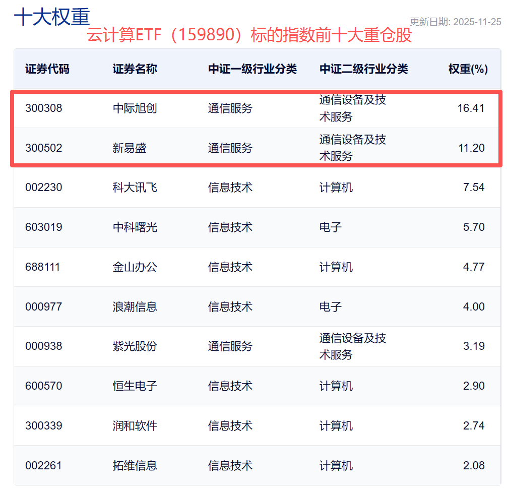 云计算ETF(159890)跟踪云计算指数,前十大成份股覆盖中际旭创、新易盛两大光模块龙头;中科曙光、浪潮信息等电子终端及组件龙头,还有科大讯飞、金山办公等软件开发龙头,兼具AI基建+AI应用属性。