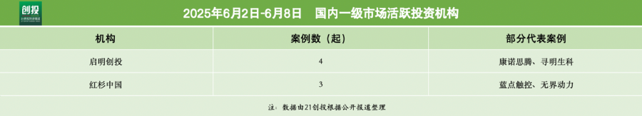 从机构投资活跃度来看,本周启明创投、红杉中国较为活跃,启明创投完4笔融资,红杉中国完成3笔融资,主要聚集在科技与制造领域与医疗健康领域。