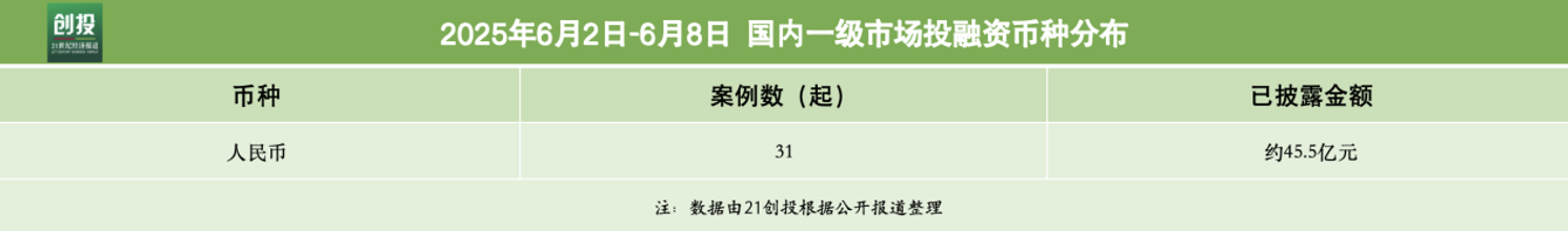 21创投不完全统计,11月17日—11月23日,报告日期内国内一级市场发生融资事件36起。其中,有31笔融资披露了融资金额和币种信息,总规模约合人民币45.5亿元人民币。