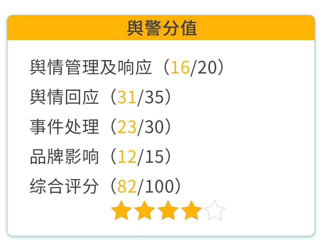 为此,南财·21消费新闻部综合企业在舆情预警与回应中涉及的公开操作维度,形成量化评分机制——具体而言,包含舆情管理及响应、舆情回应、事件处理、品牌影响四个一级指标和预防机制、回应直接度、信息透明度、处理长效性等14个二级指标,按照百分制根据重要性对不同指标赋值并打分,并以《消费舆警指数》对企业的应对速度、态度与有效度进行分析评价,为企业品牌管理与消费者的品牌认知提供参考。