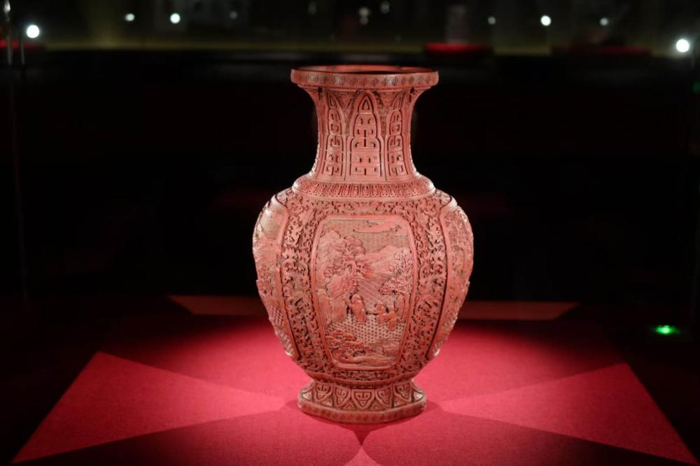 剔红开光琴棋书画山水人物海棠形瓶。本报记者 梁信 摄