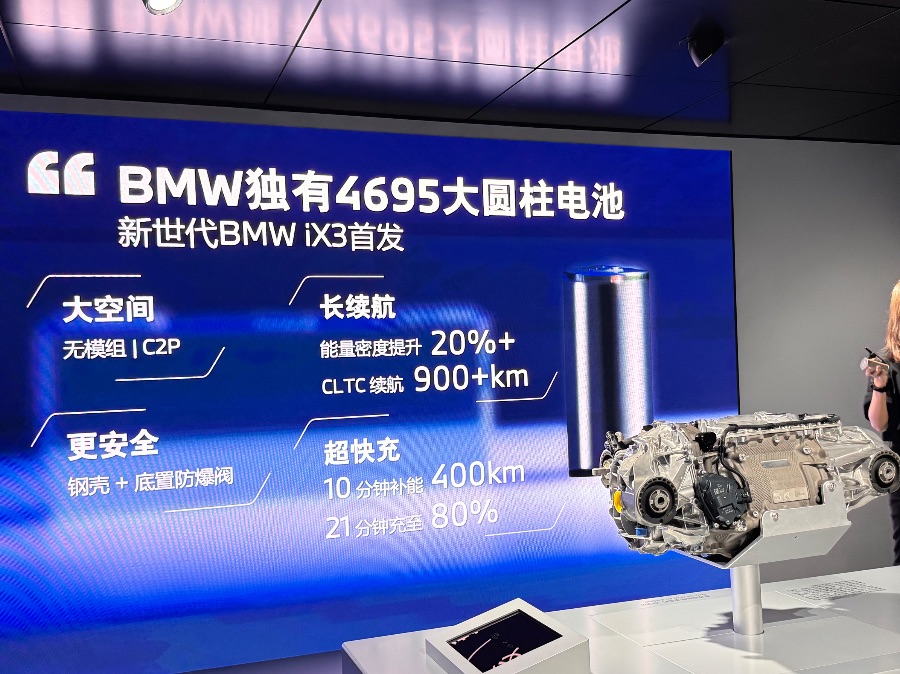 本届车展首秀的新世代电驱系统,也搭载宝马独有的4695大圆柱电芯,配合自研的“能量智控系统”,国产新世代BMW iX3的CLTC综合续航里程突破900公里。