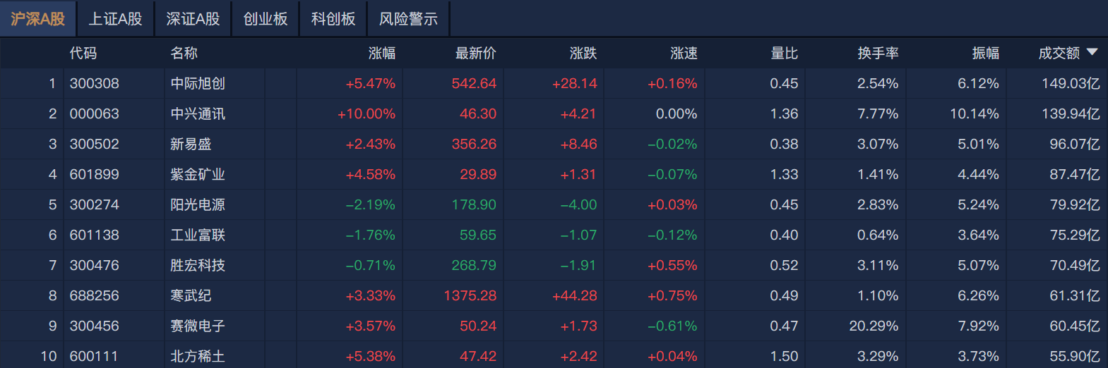 个股方面,中际旭创成交额超149亿元居首,中兴通讯、新易盛、紫金矿业成交额靠前。
