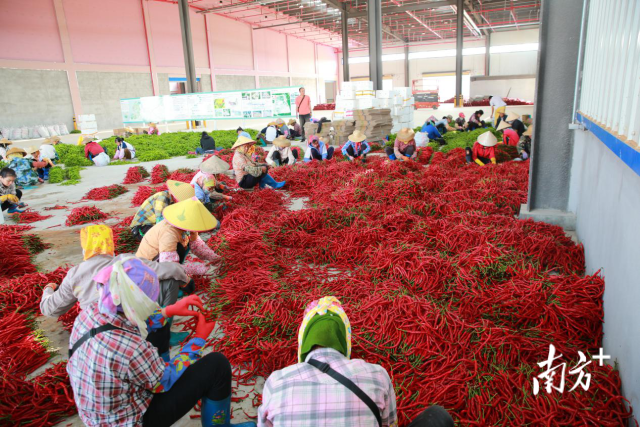 深儋农产品集配中心内,工人围着一堆堆辣椒进行分拣、装箱、打包、入库等工序。受访者供图