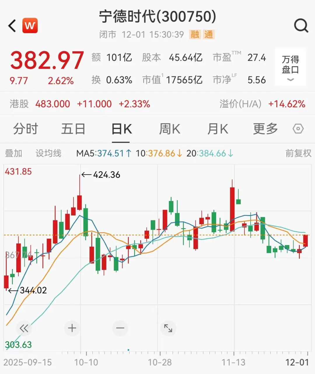 12月1日,宁德时代A股尾盘拉升,收于382.97元/股,涨幅为2.62%,总市值为1.75万亿元。