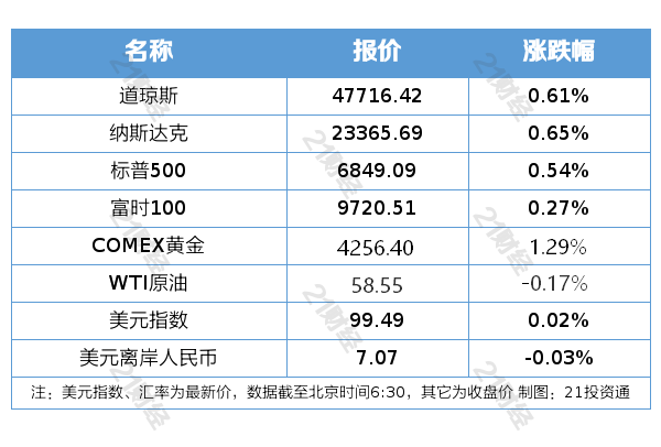 纽约股市三大股指11月28日上涨。截至11月28日收盘,道琼斯工业平均指数比前一交易日上涨289.30点,收于47716.42点,涨幅为0.61%;标准普尔500种股票指数上涨36.48点,收于6849.09点,涨幅为0.54%;纳斯达克综合指数上涨151.00点,收于23365.69点,涨幅为0.65%。