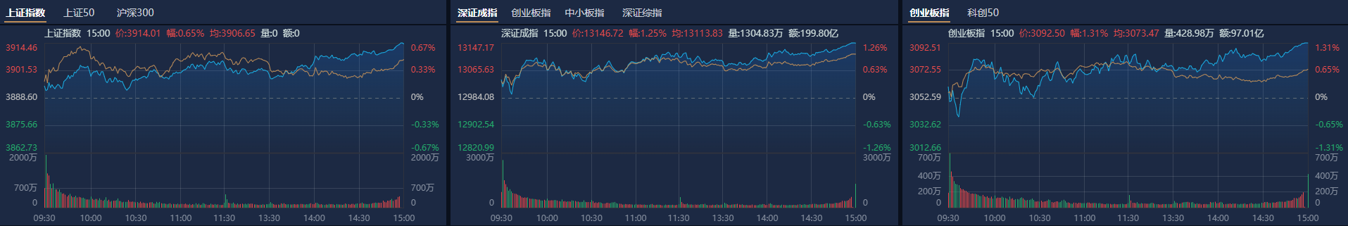 12月首个交易日,A股市场震荡拉升,沪指重返3900点上方,全市场近3400只个股上涨。截至收盘,沪指涨0.65%,深成指涨1.25%,创业板指涨1.31%。板块方面,消费电子、有色金属等板块涨幅居前,互联网电商、保险、电池等板块跌幅居前。