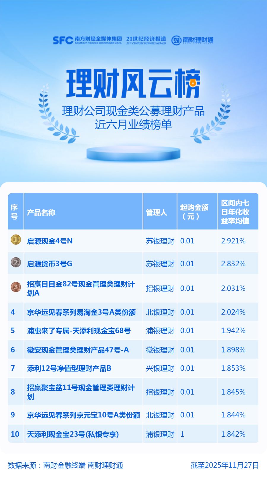 产品统计范围为理财公司发行的公募现金类产品,统计截止日期为2025年11月27日,统计区间为近6月。
