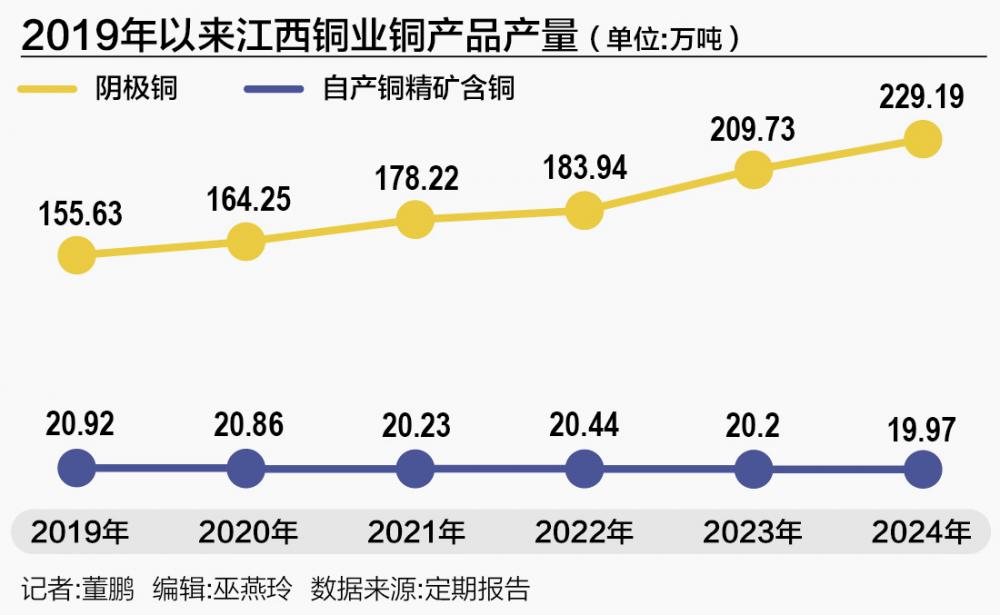 2023年、2024年,江西铜业自产铜精矿含铜分别达到20.2万吨、19.97万吨。以上矿产铜,全部来自于公司在产的德兴铜矿、永平铜矿等五大自有矿山。