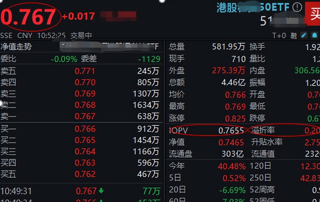 例如随机截取一只港股通ETF的盘中数据,可以看到当前价格0.767高于实时参考净值IOPV0.7655,显示溢折率为0.20%。反映出当前该ETF购买需求相对较大,出现了轻微的溢价情况。