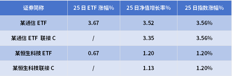 例如,11月25日,有的联接基金涨幅比ETF高,有的有比ETF涨幅差一点。这是怎么回事?收益差在哪?