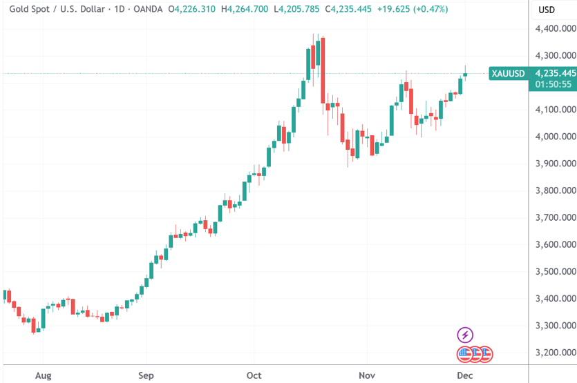 与此同时,现货黄金最高摸到每盎司4264美元,也是10月中旬创历史高位之后的六周新高。