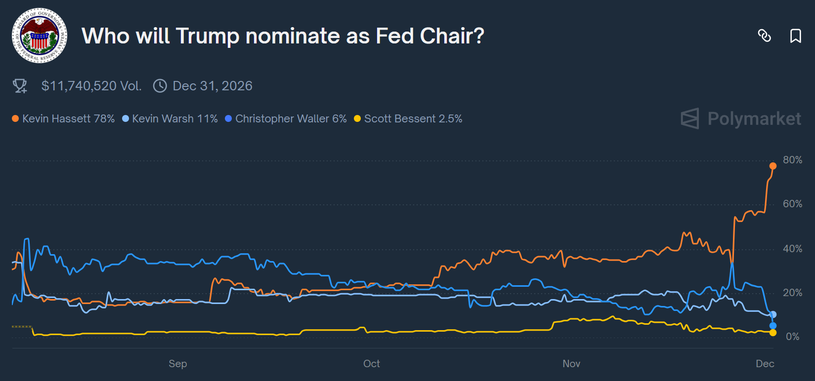 另外随着美国总统特朗普宣布已经决定下一任美联储主席提名人选,现任白宫经济委主任凯文·哈塞特已被公认为头号候补。预测市场Polymarket数据显示,哈塞特年内拿到提名的概率周一飙升至近8成——毫无疑问他是绝对的“大鸽派”。