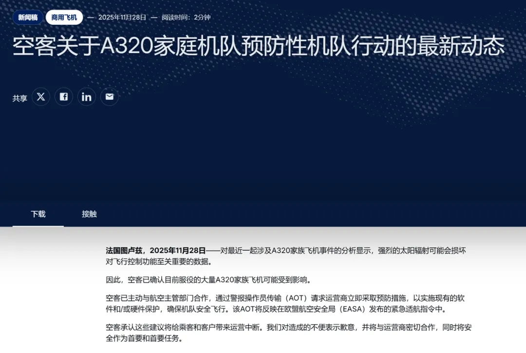 当地时间11月28日,空客宣布,约6000架空客A320飞机的飞行控制系统存在安全隐患,必须接受检查。空客对一起涉及A320系列飞机的事件进行分析后发现,强烈的太阳辐射可能会破坏一些影响飞行控制系统正常运行的关键数据。空客于北京时间2025年11月29日凌晨发布紧急运营商通告(AOT),要求运营商立即采取预防性措施,包括及时安装适用的软件或更换硬件,以消除潜在的安全隐患,确保机队安全飞行。