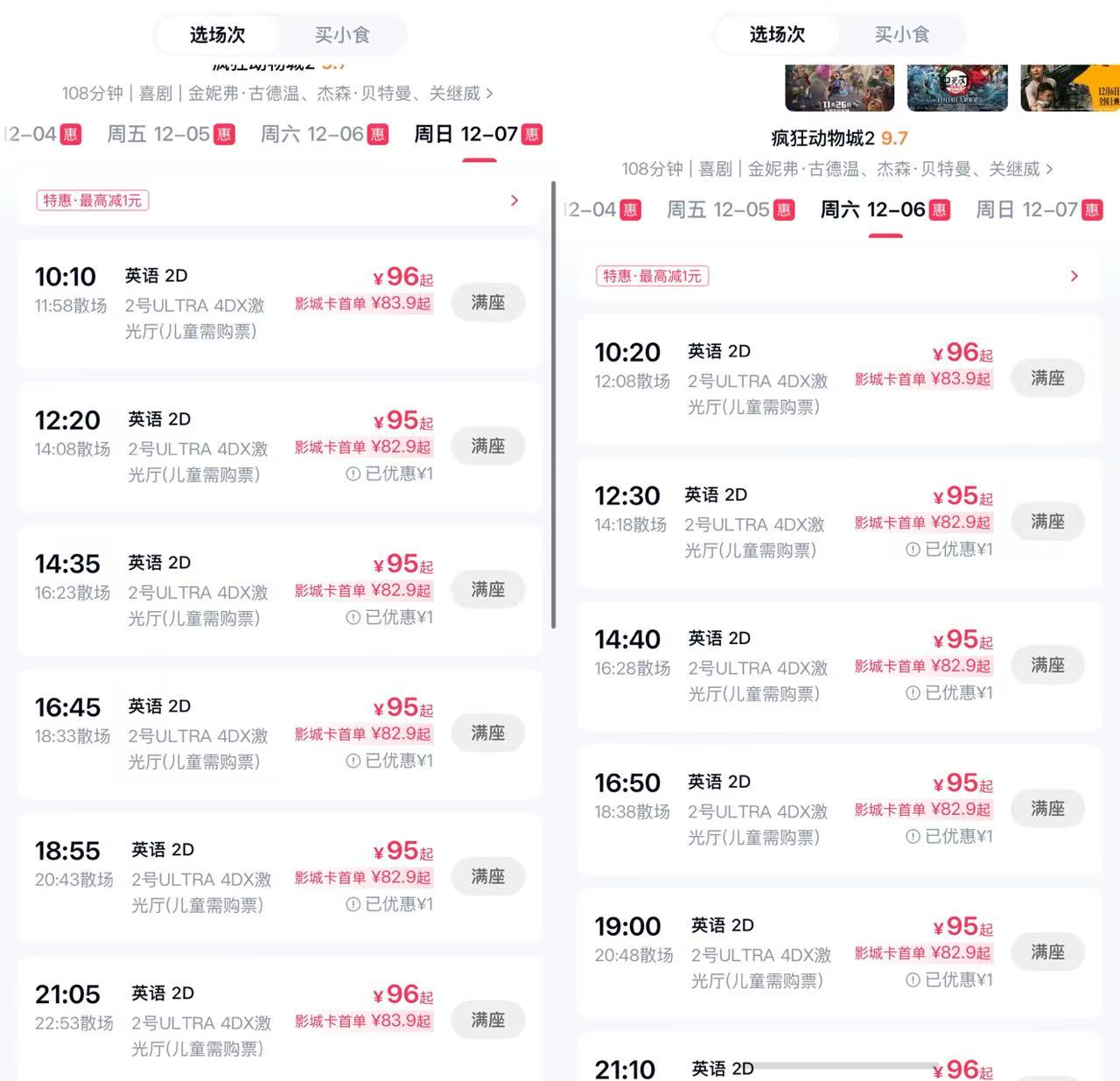 蓝鲸新闻记者从购票平台选取北京、上海等多个影院发现,当天的多个4D场次均显示满座,而部分周五、周六周日的场次也已提前售罄。