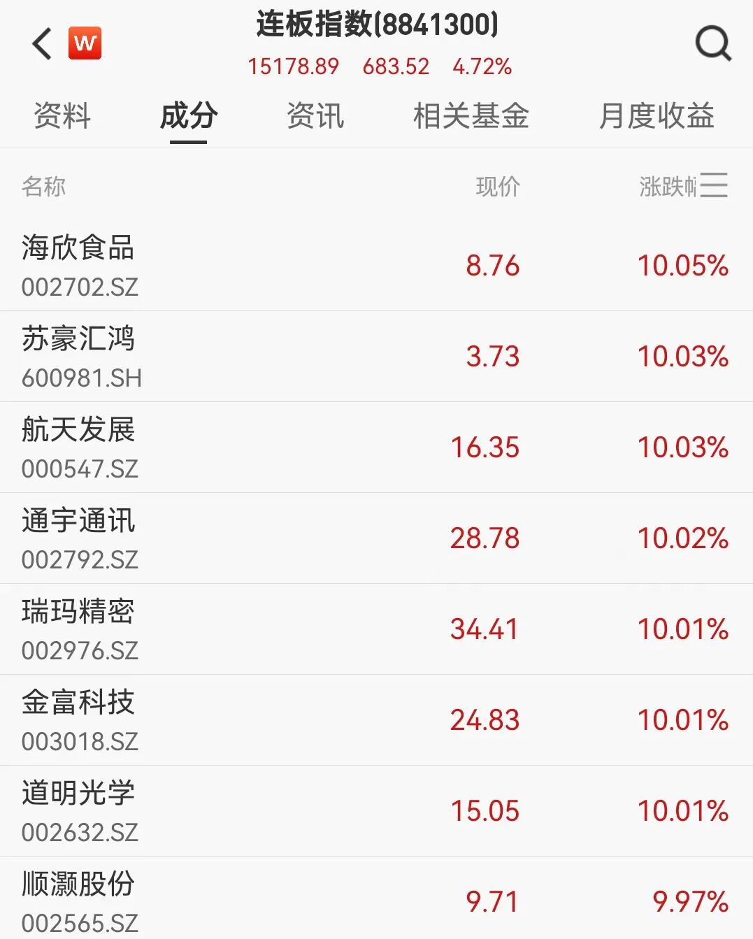 连板指数走强,海王生物5连板,道明光学、通宇通讯4连板,瑞玛精密等3连板。人造肉概念海欣食品再度涨停。