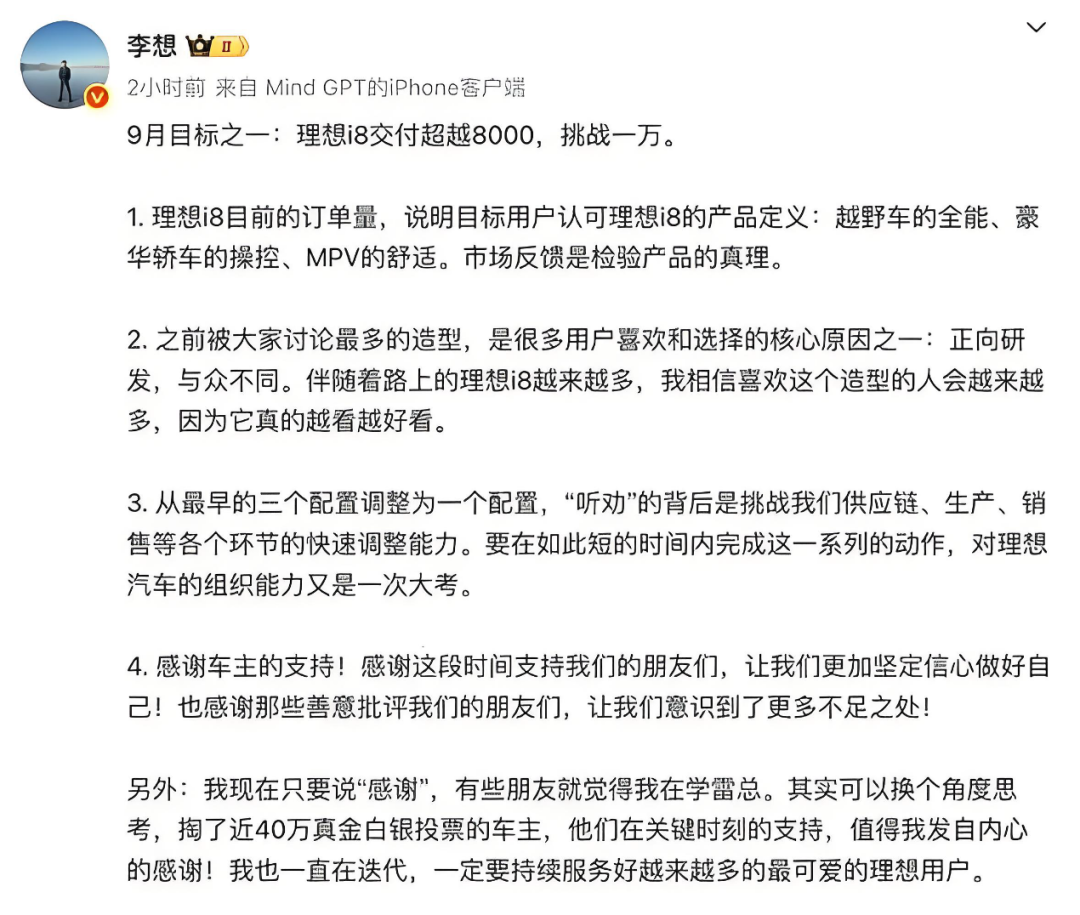 在产品上,李想提到了聚焦用户价值,而非只是交付,对用户真正有价值的东西才值得交付,而不仅仅是完成各种交付的任务。