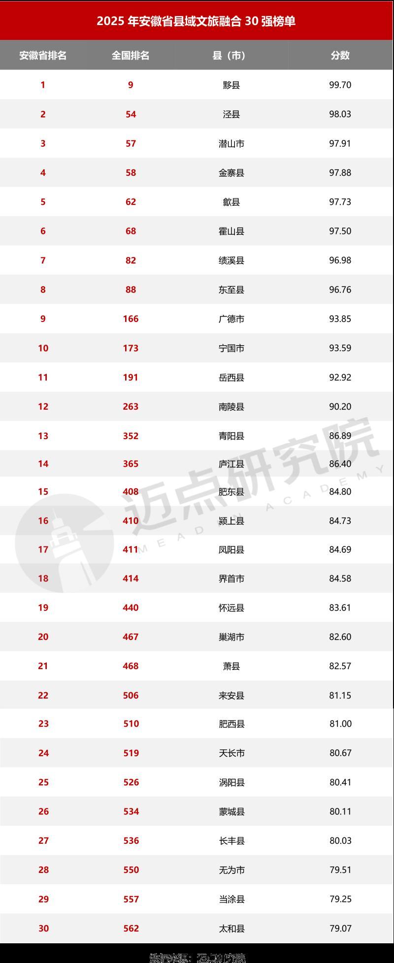 近期,迈点研究院发布了“2025年全国县域文旅融合100强榜单”,安徽省有8个县域入榜,分别为黟县、泾县、潜山市、金寨县、歙县、霍山县、绩溪县、东至县。从“2025年安徽省县域文旅融合30强榜单”来看,30强县市中有21位跻身全国前500,整体实力较强。