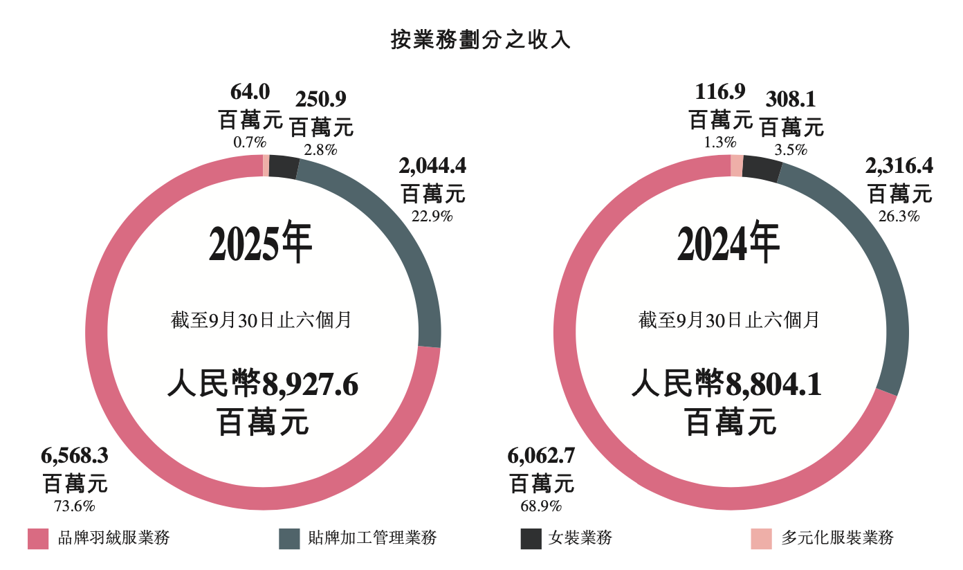 拉长时间线看,相比2023/24上半财年、2024/25上半财年高达28.1%、22.7%的收入增速,品牌羽绒服业务2025/26上半财年8.3%的收入增速有所放缓。