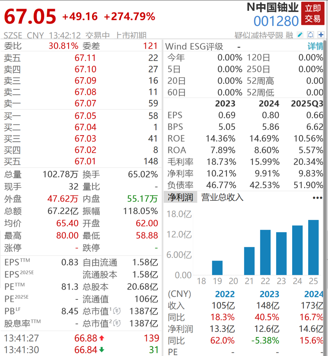 上市首日,中国铀业高开,盘中最高报80元/股。截至12月3日13:42,该股涨幅为274.79%,总市值1387亿元。