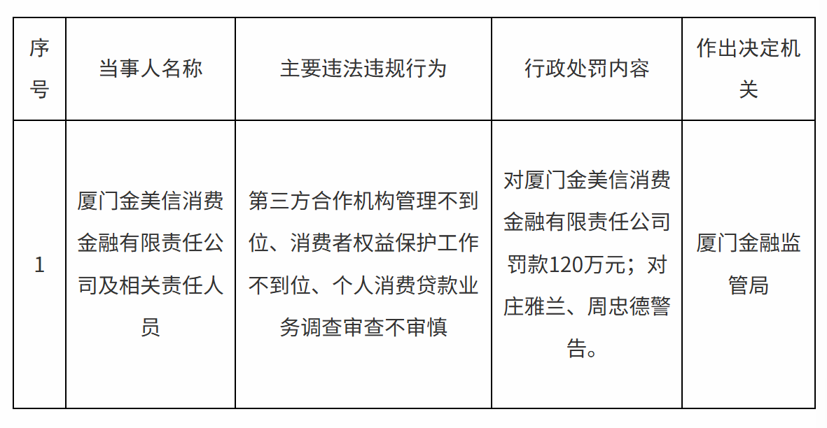 近日,国家金融监督管理总局厦门监管局发布公告,厦门金美信消金因为第三方合作机构管理不到位、消费者权益保护工作不到位、个人消费贷款业务调查审查不审慎被处罚120万元。