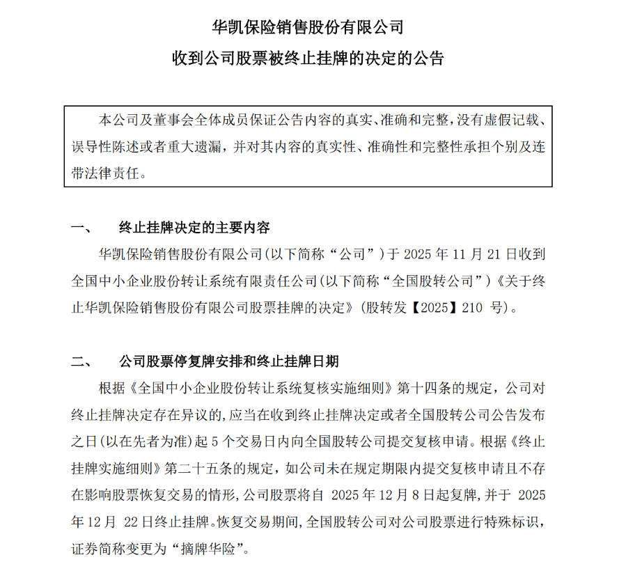 在年报失约并停牌近半年后,华凯保险销售股份有限公司(下称“华凯保险”)近日公告称,收到公司股票被终止挂牌决定。若对终止挂牌决定无异议,华凯保险将自2025年12月8日起复牌,并于2025年12月22日终止挂牌。恢复交易期间,全国股转公司对华凯保险股票进行特殊标识,证券简称变更为“摘牌华险”。