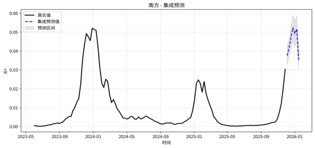 南方地区流感还将继续上升,预计流感疫情持续时间比北方长,将在12月中下旬至2026年1月初达到高峰,短期下降后小幅度反弹,随后逐渐下降。