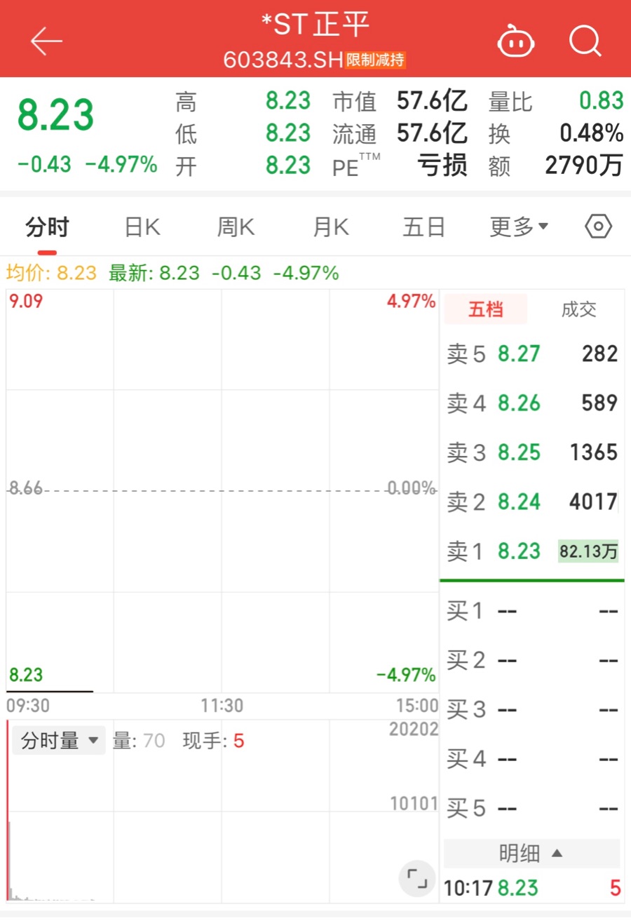 12月3日,曾狂揽26个涨停板的*ST正平(正平股份,603843.SH),在第三度停牌核查后,未能延续此前行情,复牌首日便一字跌停,截至10时16分,该股报8.23元/股,跌幅4.97%,跌停板封单超80万手,资金出逃迹象明显。