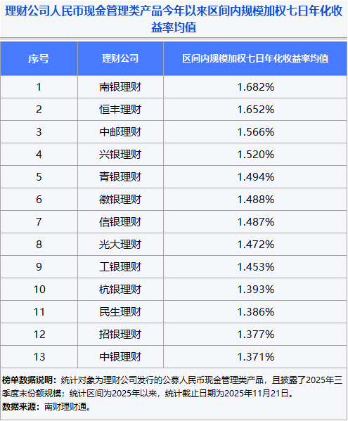 (文章数据说明:榜单统计对象为理财公司发行的公募人民币现金管理类产品,且披露了2025年三季度末份额规模;统计区间为2025年以来,统计截止日期为2025年11月21日;数据来源:南财理财通。)