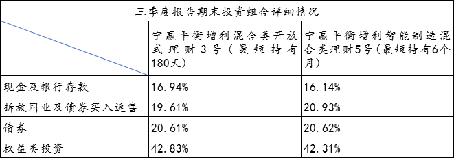 宁银理财“宁赢平衡增利混合类开放式理财3号(最短持有180天)”和“宁赢平衡增利智能制造混合类理财5号(最短持有6个月)”包揽本期榜单冠亚军,产品近6月净值增长率分别达到10.40%和10.28%。具体到持仓来看,两款产品投资配置比例高度相似,前十大持仓均为现金、银行间质押式回购、银行二级资本债以及股票。