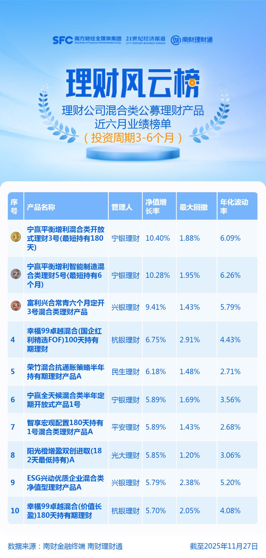截至2025年11月27日,南财理财通数据显示,理财公司3-6个月(含)期限混合类理财近6月平均净值增长率为2.88%,最大回撤均值为0.86%,2只产品近6月净值增长率超过10%。