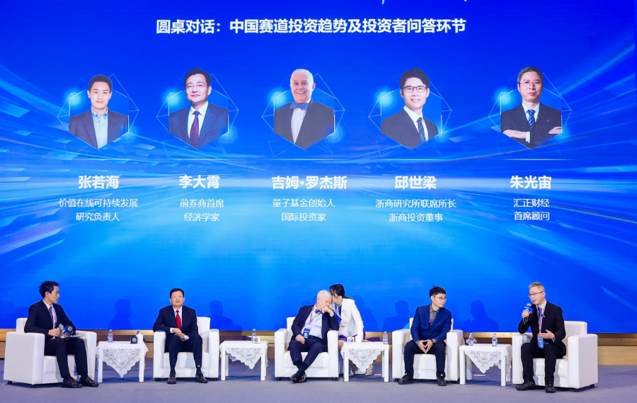 在圆桌论坛环节,汇正财经首席顾问朱光宙与吉姆·罗杰斯、前券商首席经济学家李大霄,浙商投资董事、浙商研究所联席所长邱世梁同台对话,就“中国赛道投资趋势”这一主题进行深入讨论并答投资者问。