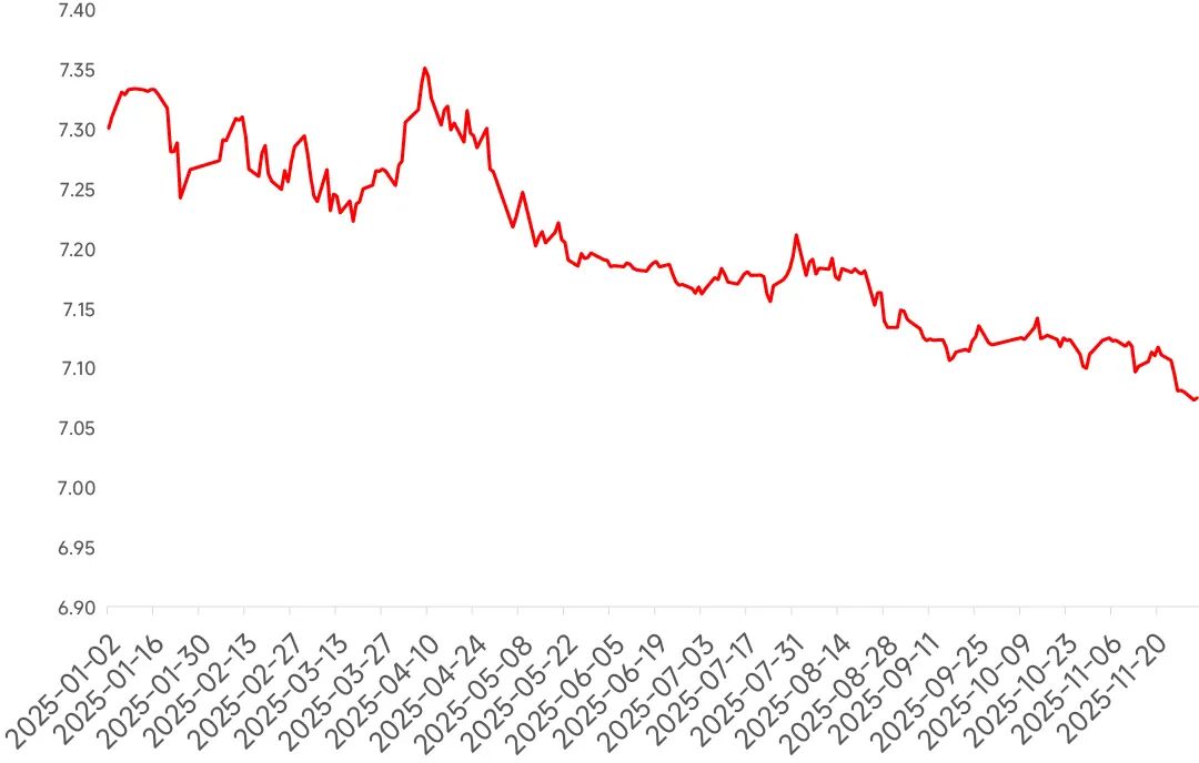 之后截至12月2日,基本保持在7.07区间,较今年4月低点7.43累计升值近5%。
