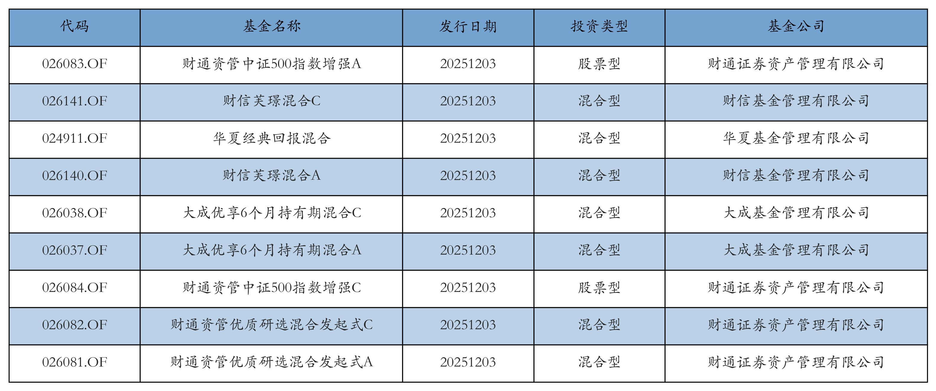 昨日有9只新基金发行,分别为:财通资管中证500指数增强A、财信芙璟混合C、华夏经典回报混合、财信芙璟混合A、大成优享6个月持有期混合C、大成优享6个月持有期混合A、财通资管中证500指数增强C、财通资管优质研选混合发起式C、财通资管优质研选混合发起式A,详情见下表: