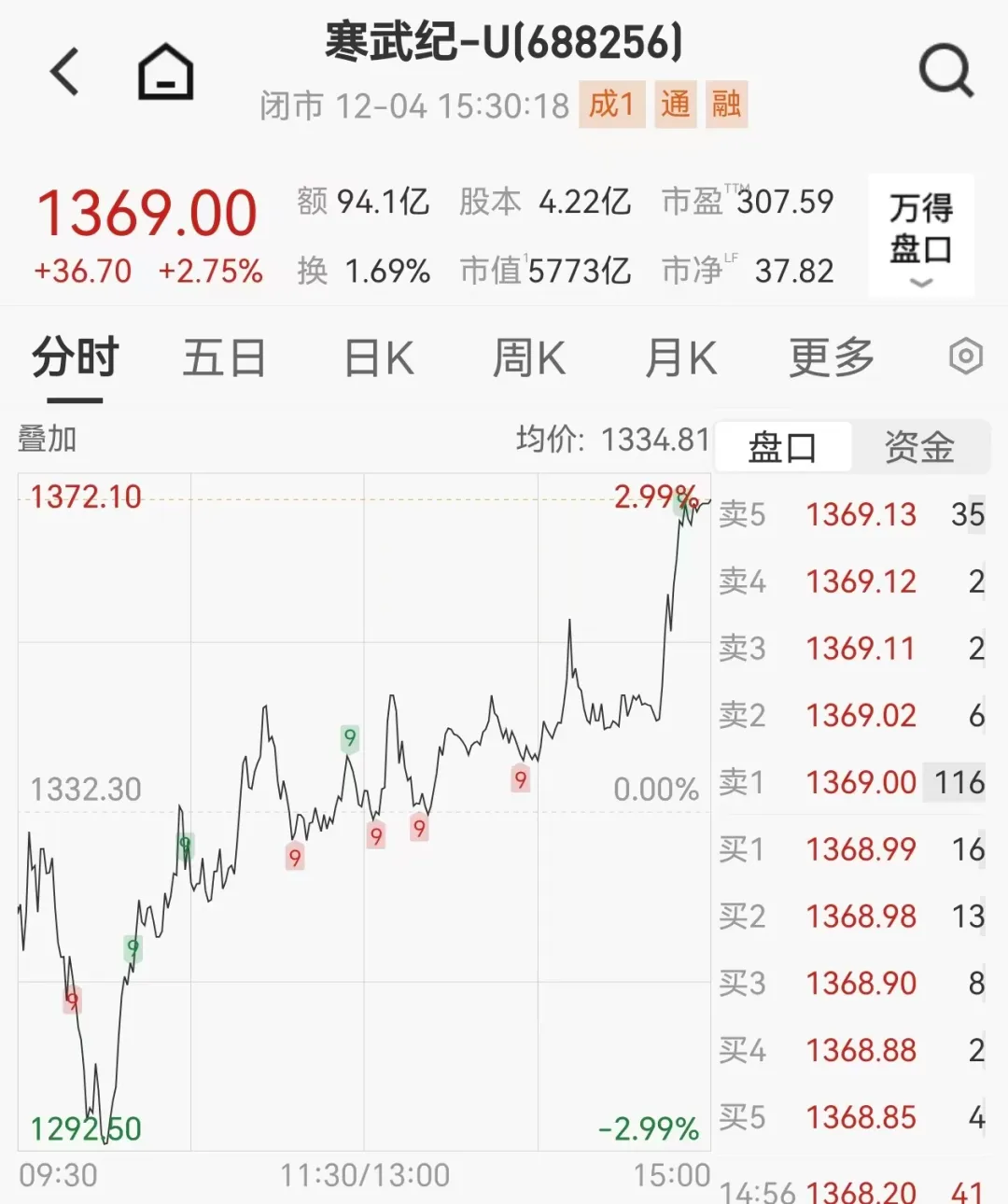 12月4日,A股市场探底回升,创业板指涨超1%,早盘一度跌超0.5%。沪深两市成交额1.56万亿,较上一个交易日缩量1219亿,全市场超3800只个股下跌。