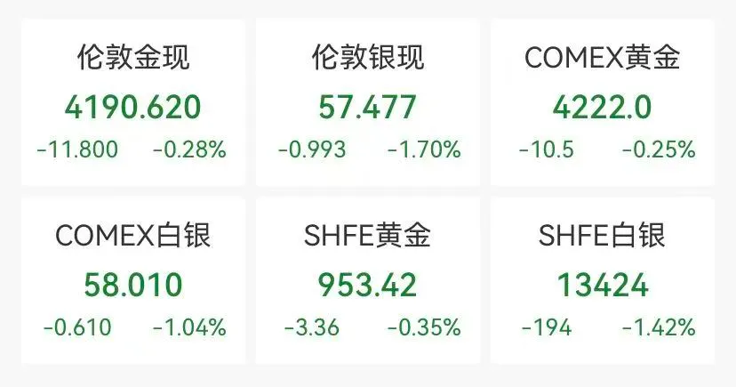 国际贵金属震荡走低,现货白银领跌,日内跌幅一度超2%,截至15:30,现货白银下跌1.7%,报57.477美元/盎司,现货黄金跌近0.3%,跌破4200美元/盎司。