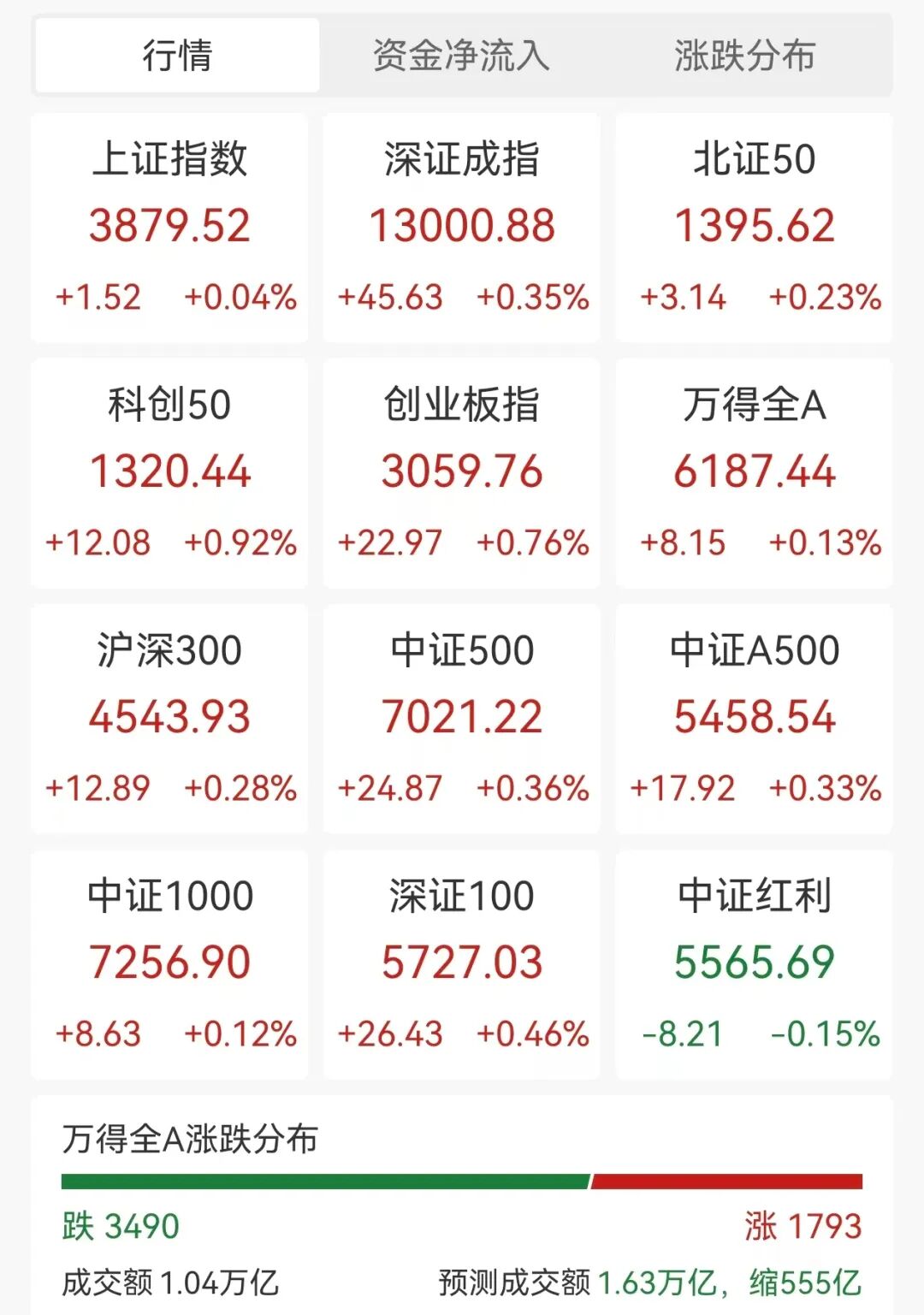 12月4日,A股市场早盘探底回升,创业板指盘中下跌0.5%,而后翻红一度涨超1%。沪深两市半日成交额1.04万亿,较上个交易日缩量555亿。全市场近3500只个股下跌。