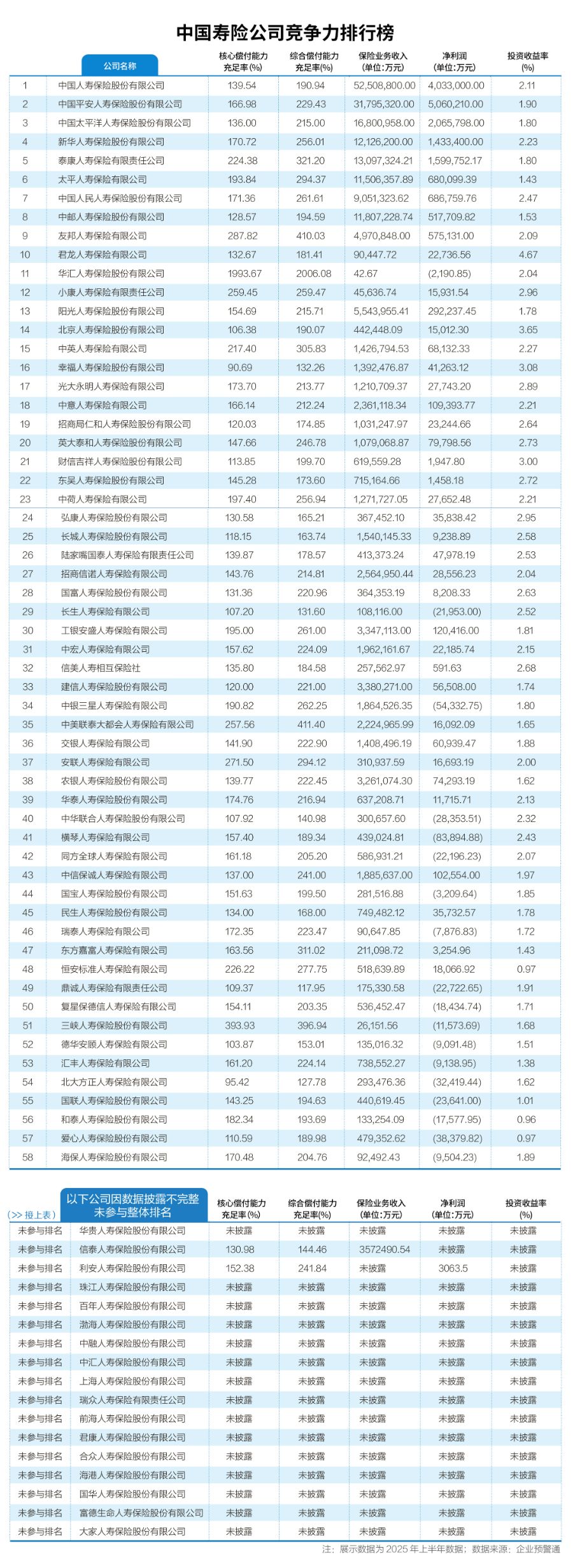 根据2024 年全年数据及2025 年上半年数据,《报告》对寿险公司进行综合评估和竞争力排名,指标包括核心偿付能力充足率、综合偿付能力充足率、保险业务收入、净利润和投资收益率等。