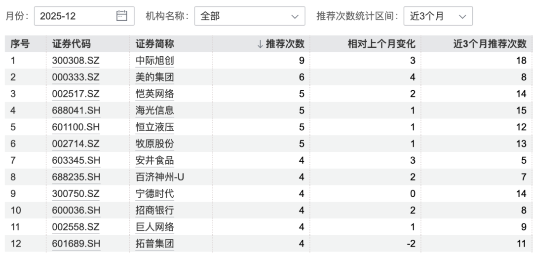 Wind数据显示,截至12月3日中午,已有36家券商发布了12月金股推荐,共计推荐226只股票。在12月金股推荐榜中,中际旭创被推荐次数最多,被9家券商同时推荐,其近3个月被推荐次数达到18次,自9月1日以来区间涨幅达到48.46%。紧随其后被推荐的是美的集团,其股价在12月3日再创年内新高。