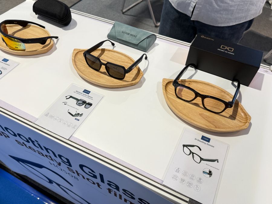在AIE澳门场的展位前,几款设计轻巧的AI眼镜整齐陈列,不时有境外采购商驻足咨询。