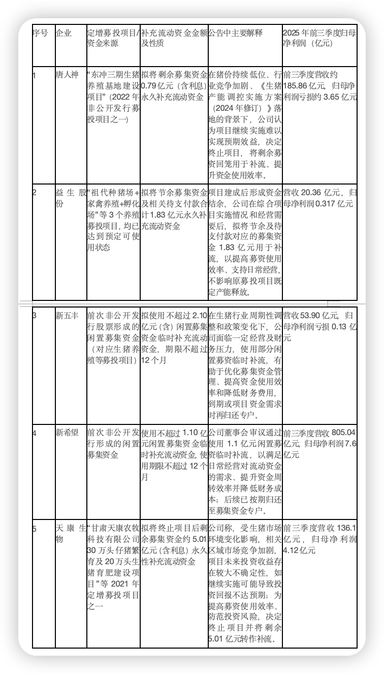 蓝鲸新闻记者梳理上市公司公告发现,从唐人神(002567.SZ)到益生股份(002458.SZ),从新五丰(600975.SH)到新希望(000876.SZ),今年以来至少有5家上市猪企宣布将前次定增募投项目资金“挪作他用”,永久或阶段性补充流动资金。