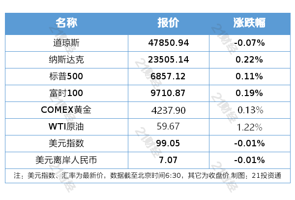 纽约股市三大股指12月4日涨跌不一。截至当天收盘,道琼斯工业平均指数比前一交易日下跌31.96点,收于47850.94点,跌幅为0.07%;标准普尔500种股票指数上涨7.40点,收于6857.12点,涨幅为0.11%;纳斯达克综合指数上涨51.04点,收于23505.14点,涨幅为0.22%。