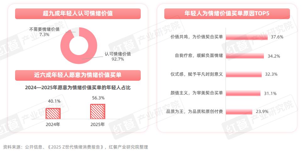 从消费端来看,近年来消费者的消费观念逐渐从物质层面转向追求情绪价值,消费者的餐饮消费不再满足于果腹充饥,而是朝着兼具美味、高颜值和趣味性的品质体验方向升级。上海市青少年研究中心发布的《2025 Z世代情绪消费报告》显示,超过九成年轻人认可情绪价值,且愿意为情绪价值买单的年轻人占比从2024年的40.1%提升至56.3%。