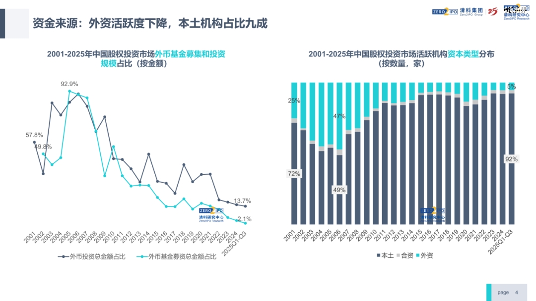 但二十年间变化不止,美元基金面临重塑。今年外资募资占比已经下降到约2%,几乎快忽略不计了,投资金额占14%。与之相对应,现在外资活跃机构只占到了5%,另外超90%都是人民币基金。人民币本土基金已经变成中国股权投资市场的主导者。