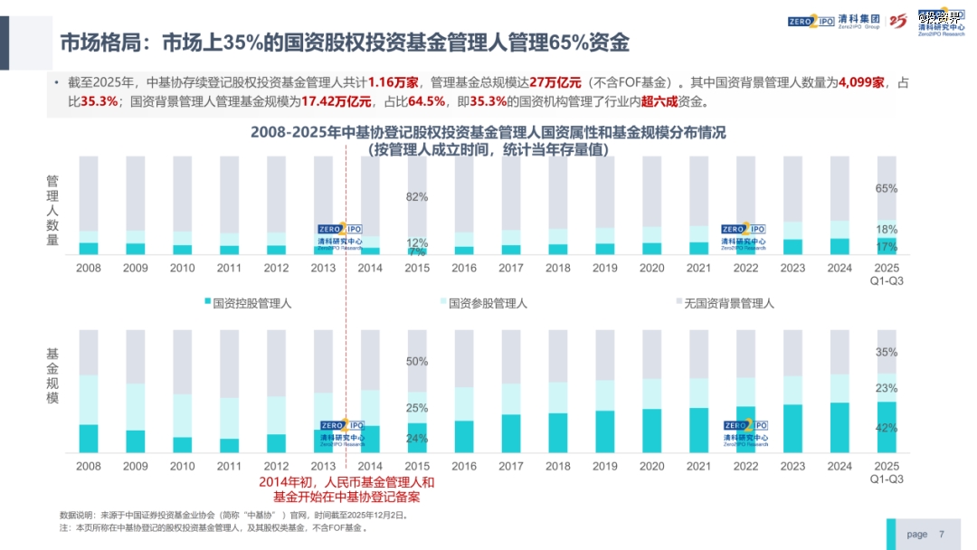 按照截至2025年中基协存续登记股权投资基金管理人数量与基金总规模计算,国资背景管理人数量占比35.3%,其所管理的基金规模占比64.5%。换言之,35%的国资机构管理了行业内超六成的钱,这个变化是比较大的。