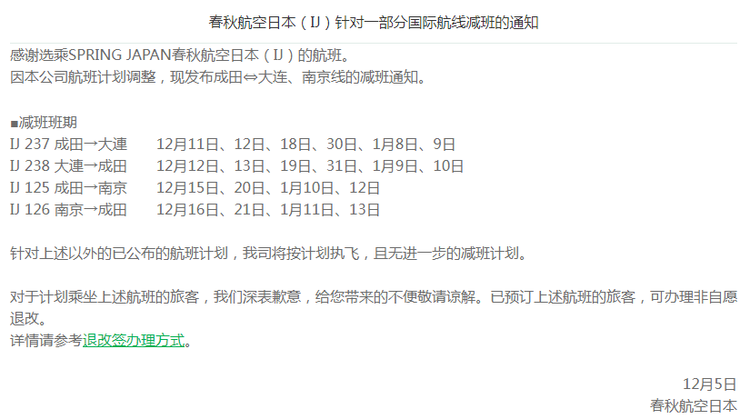 记者注意到,春秋航空虽然没有发布免费退改政策,但是已经提前公告明年部分航班的减班信息。
